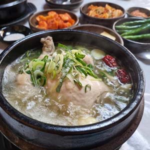 삼계탕은 한국의 대표적인 보양 음식 중 하나로, 특히 여름철 보양식으로 많이 먹습니다. 닭 한 마리를 통째로 사용하여 인삼, 대추, 마늘 등 다양한 약재와 함께 끓이는 이 음식은 영양가가 높고 맛도 일품입니다.