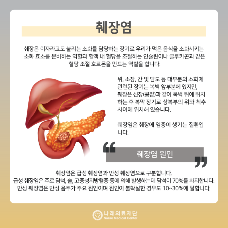 췌장염은 췌장에 염증이 발생하는 질환으로, 급성 췌장염과 만성 췌장염으로 나눌 수 있어요.